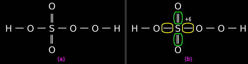 • There are 11 bonds in total. Since we are trying to find the oxidation number of S, we need to consider only those bonds linked to S. So we need not consider the two O一H bonds. Thus there are nine bonds to analyze.